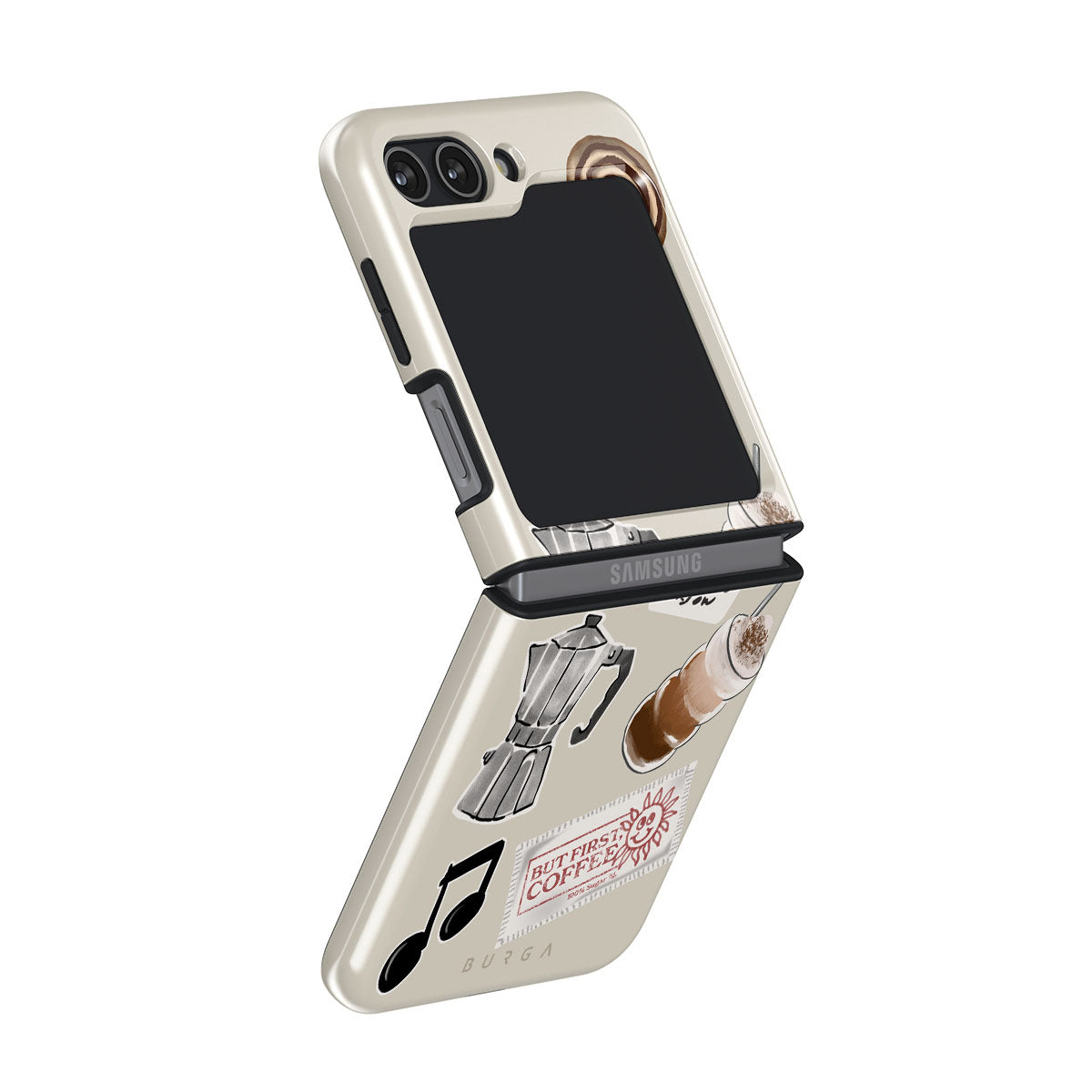 Dieses Design enthält: Mokkakanne, Frappe, Zimtschnecke, Schokoladenherz, „Not a morning person“-Sticker, „But First, Coffee“-Kassenbon, Musiknote.