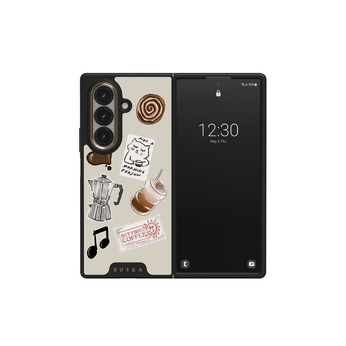 Dieses Design enthält: Mokkakanne, Frappe, Zimtschnecke, Schokoladenherz, „Not a morning person“-Sticker, „But First, Coffee“-Kassenbon, Musiknote.