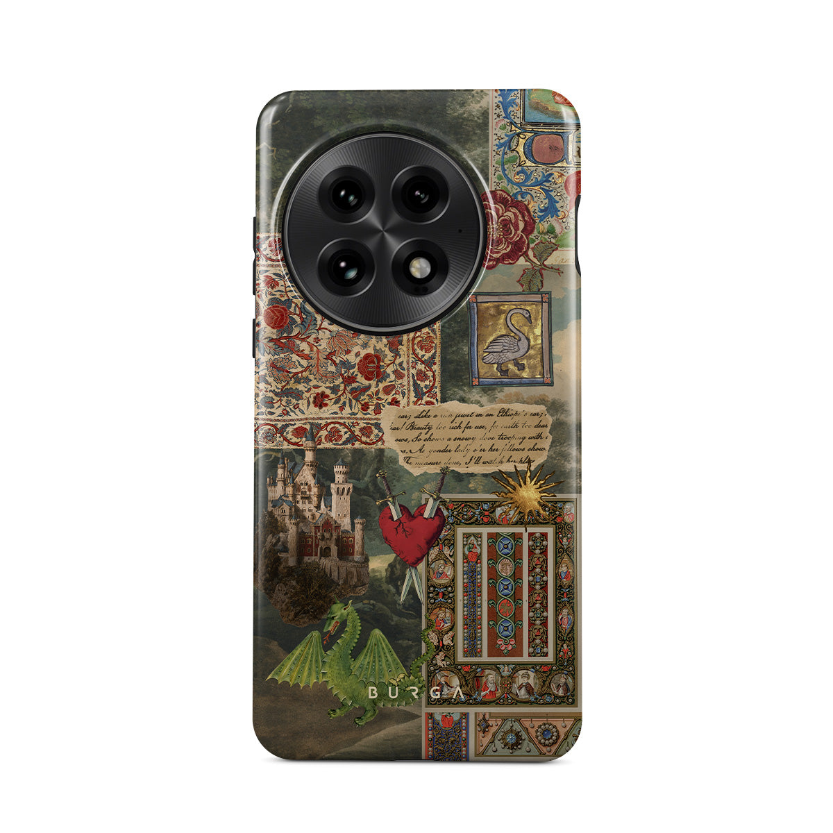Dieses Design enthält: handgeschriebene Kalligrafie, Vintage-Druck, mittelalterliches Design, Blumenmuster, Buchillustrationen im alten Stil, Herz, Drache, Burg
