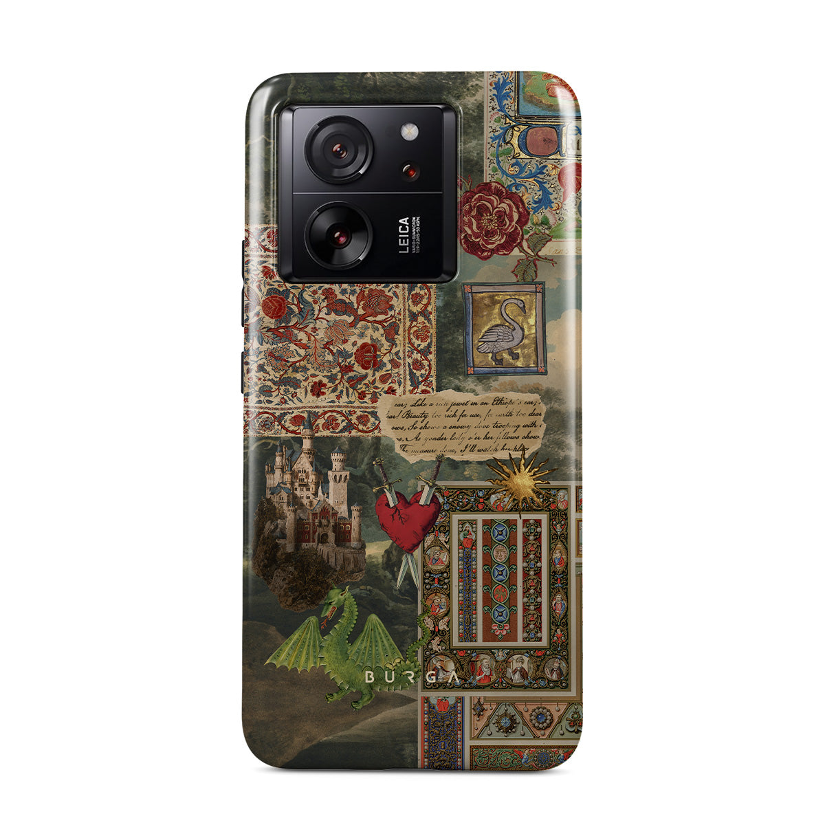 Dieses Design enthält: handgeschriebene Kalligrafie, Vintage-Druck, mittelalterliches Design, Blumenmuster, Buchillustrationen im alten Stil, Herz, Drache, Burg