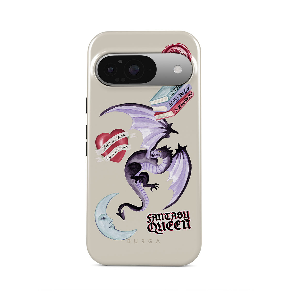 Dieses Design enthält: lila Drache, „Fantasy Queen“-Sticker, Halbmond, lilafarbener Wachssiegel, Herz mit Nachricht, Bücher.