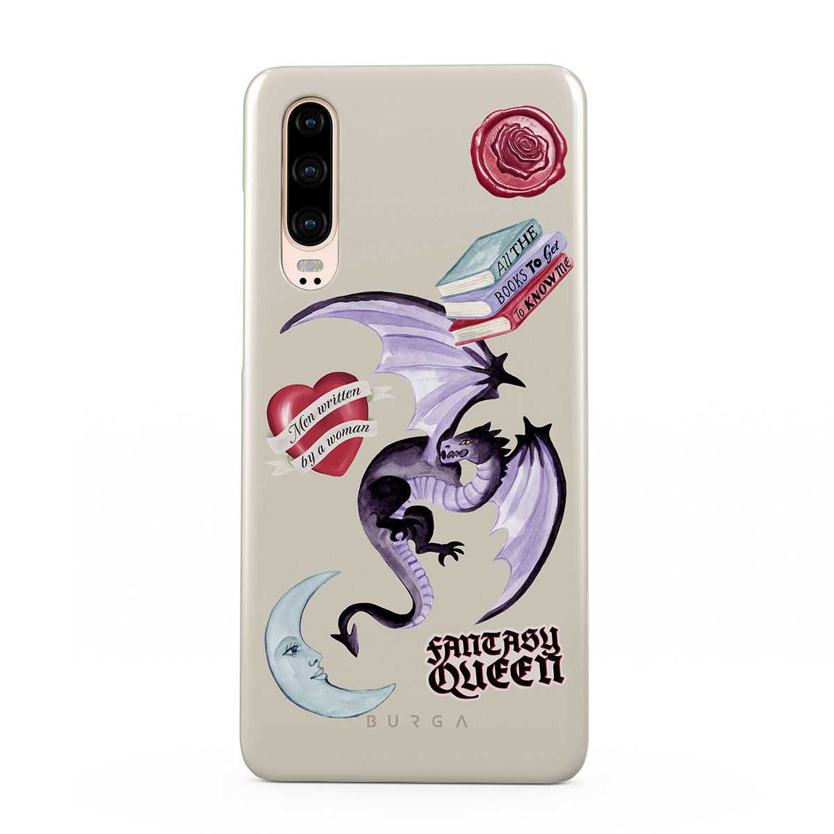 Dieses Design enthält: lila Drache, „Fantasy Queen“-Sticker, Halbmond, lilafarbener Wachssiegel, Herz mit Nachricht, Bücher.