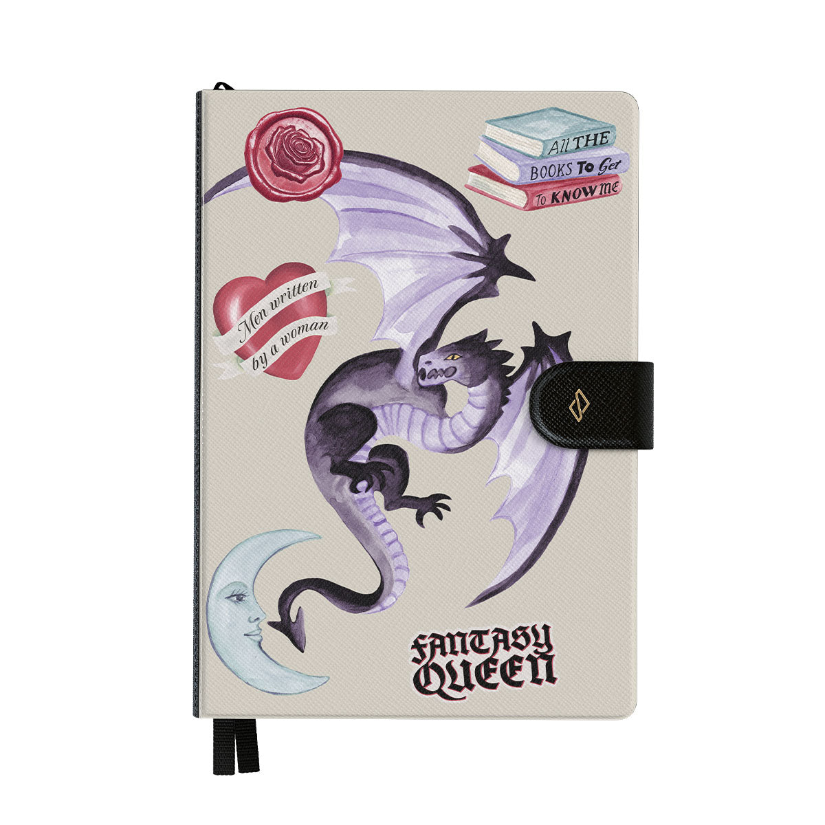 Dieses Design enthält: lila Drache, „Fantasy Queen“-Sticker, Halbmond, lilafarbener Wachssiegel, Herz mit Nachricht, Bücher.