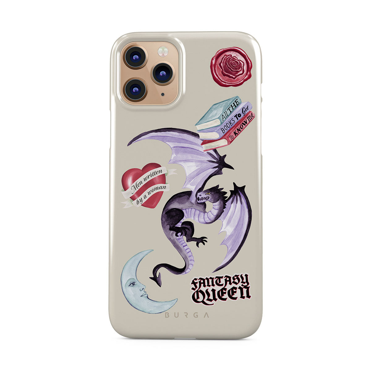 Dieses Design enthält: lila Drache, „Fantasy Queen“-Sticker, Halbmond, lilafarbener Wachssiegel, Herz mit Nachricht, Bücher.