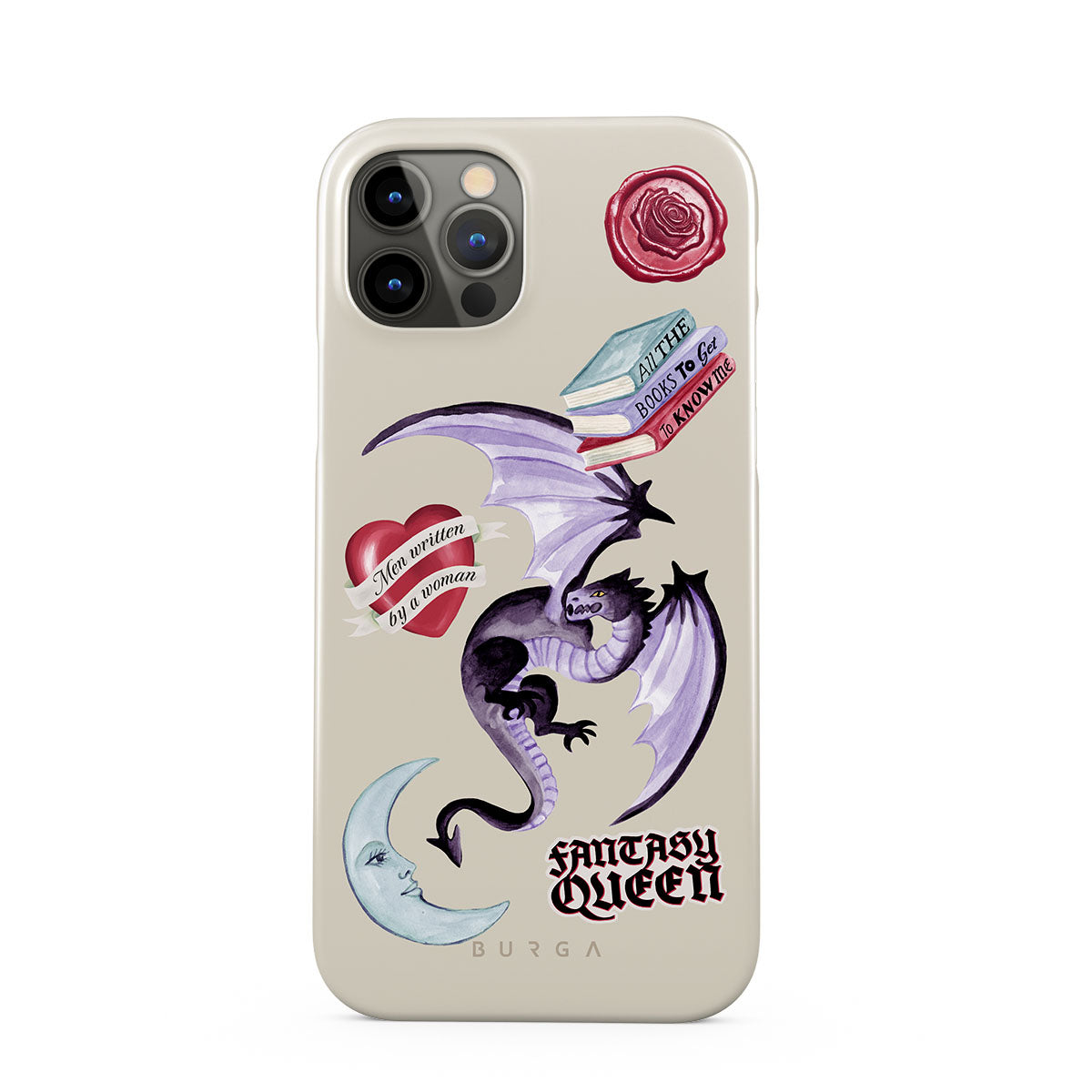 Dieses Design enthält: lila Drache, „Fantasy Queen“-Sticker, Halbmond, lilafarbener Wachssiegel, Herz mit Nachricht, Bücher.