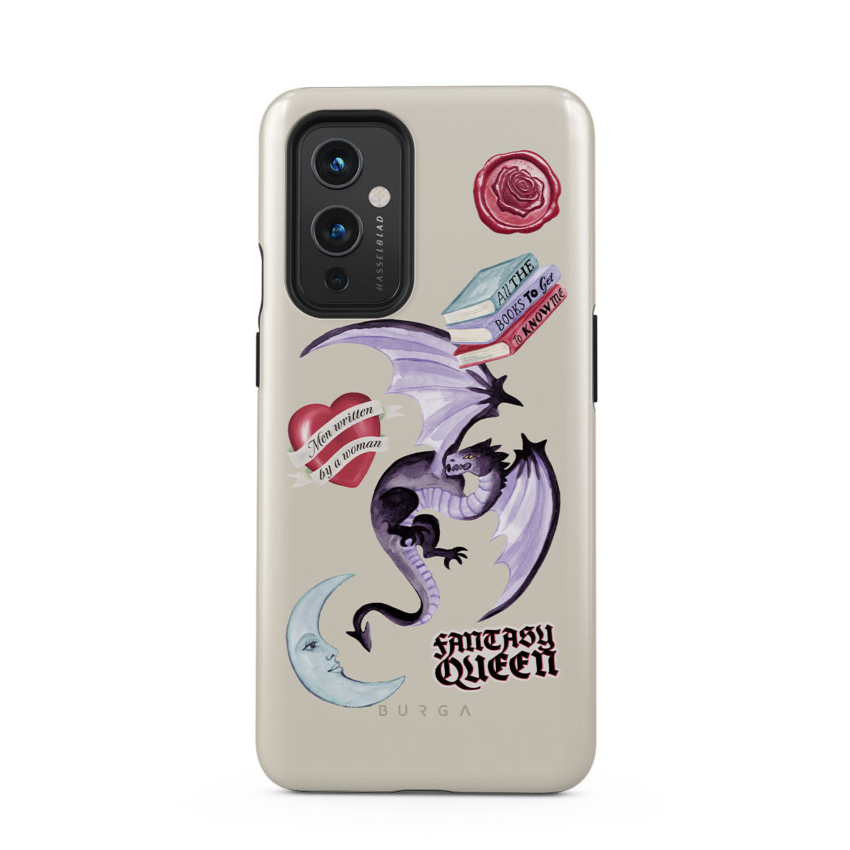 Dieses Design enthält: lila Drache, „Fantasy Queen“-Sticker, Halbmond, lilafarbener Wachssiegel, Herz mit Nachricht, Bücher.