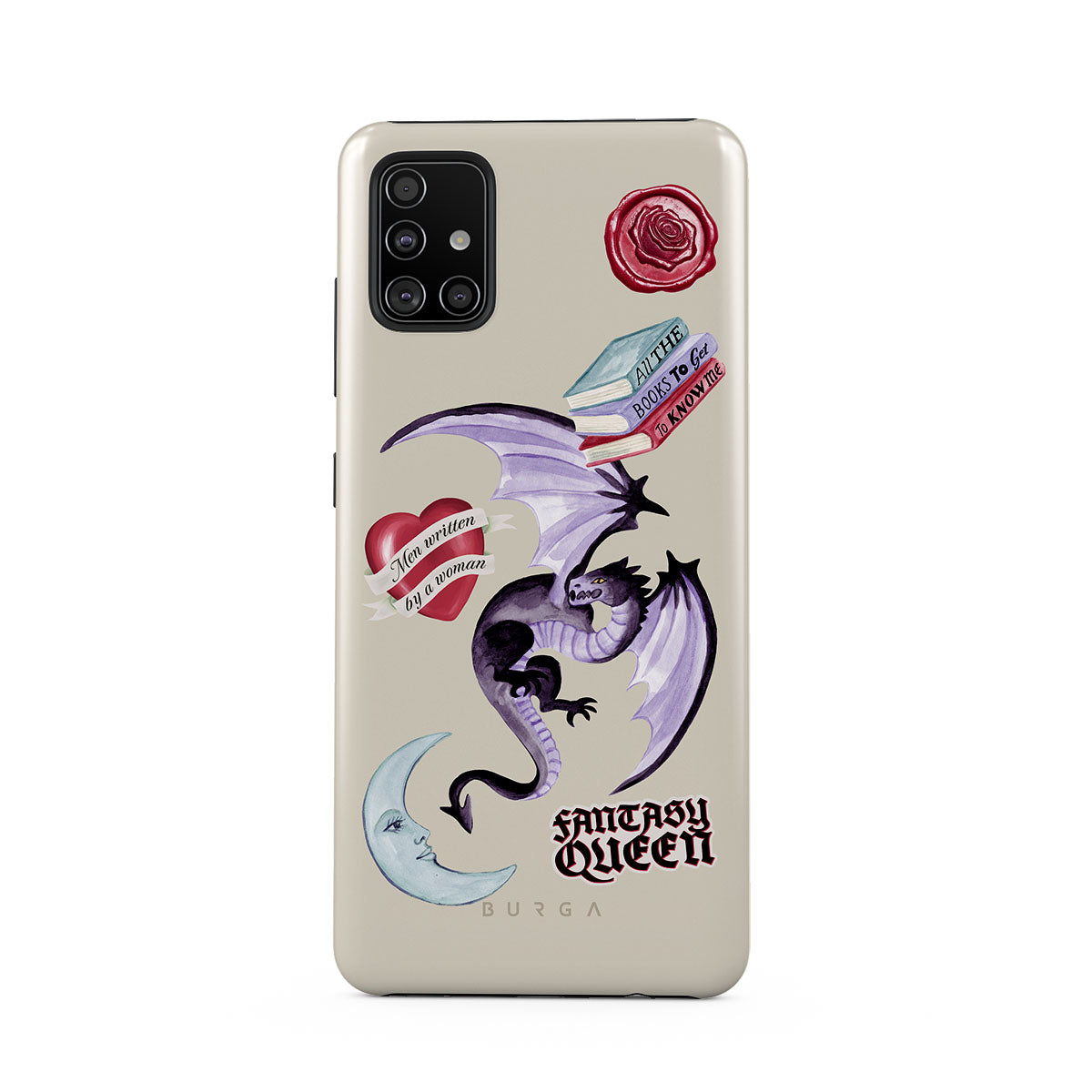 Dieses Design enthält: lila Drache, „Fantasy Queen“-Sticker, Halbmond, lilafarbener Wachssiegel, Herz mit Nachricht, Bücher.