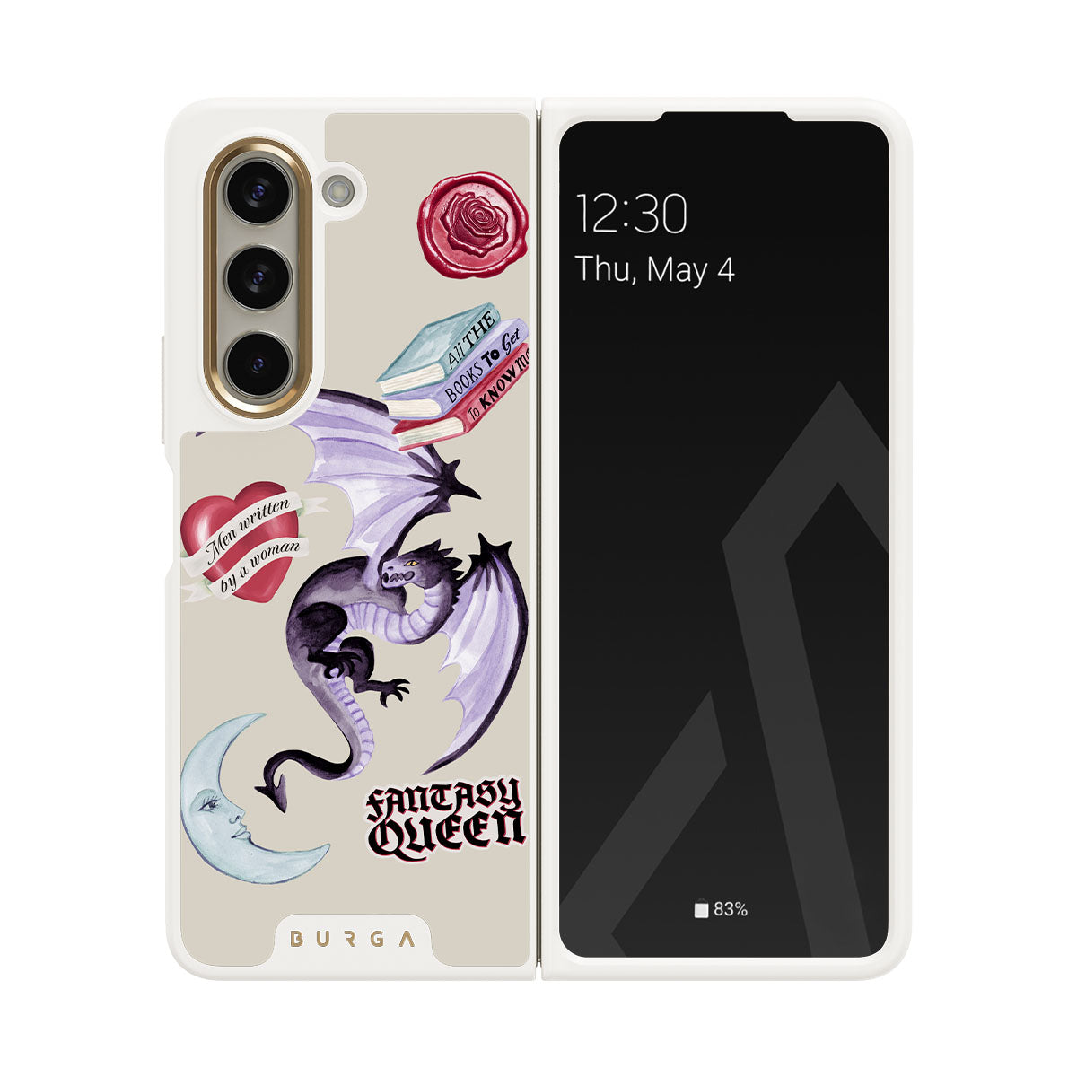 Dieses Design enthält: lila Drache, „Fantasy Queen“-Sticker, Halbmond, lilafarbener Wachssiegel, Herz mit Nachricht, Bücher.