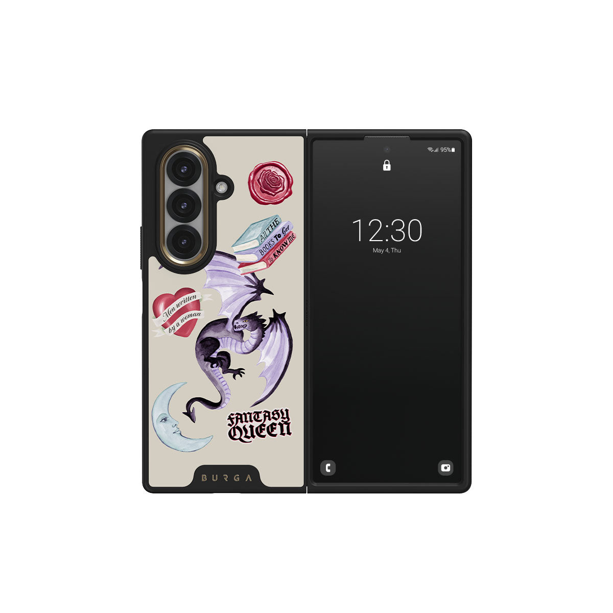 Dieses Design enthält: lila Drache, „Fantasy Queen“-Sticker, Halbmond, lilafarbener Wachssiegel, Herz mit Nachricht, Bücher.