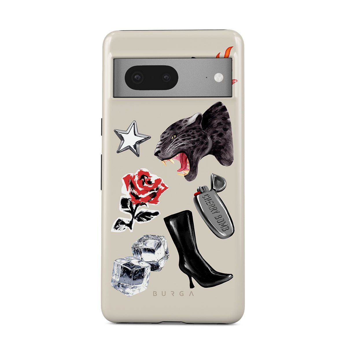 Dieses Design enthält: schwarzer Panther, rote Rose, brennende Paprika, silbernes Feuerzeug, schwarze kniehohe Stiefel, Eiswürfel, silberner Stern.