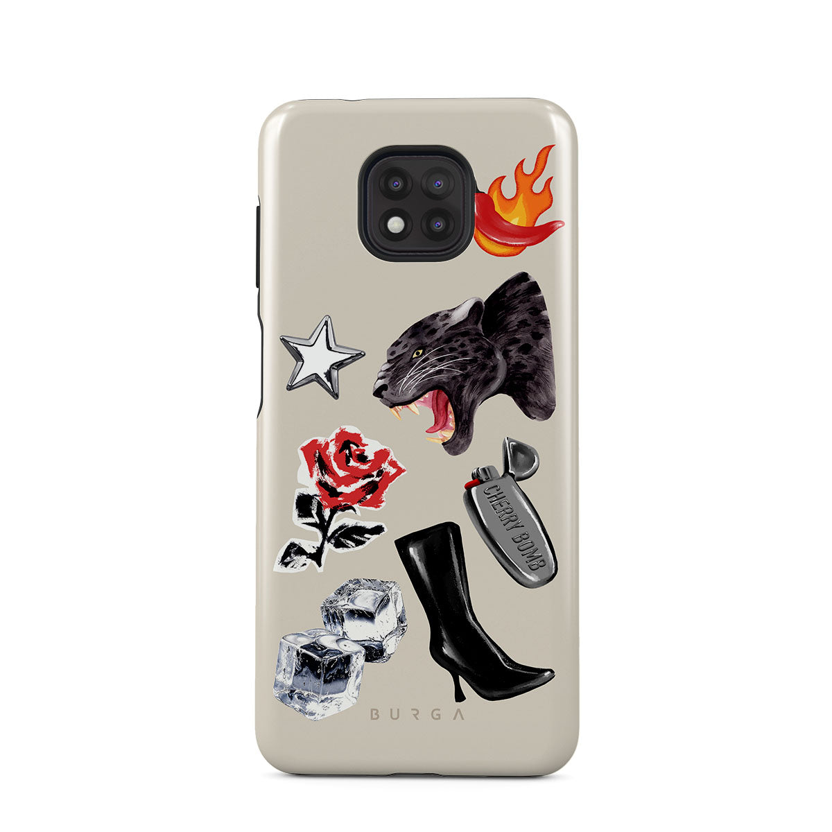 Dieses Design enthält: schwarzer Panther, rote Rose, brennende Paprika, silbernes Feuerzeug, schwarze kniehohe Stiefel, Eiswürfel, silberner Stern.