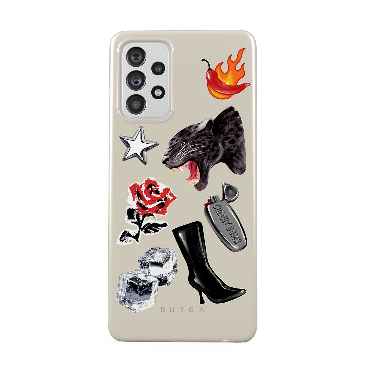 Dieses Design enthält: schwarzer Panther, rote Rose, brennende Paprika, silbernes Feuerzeug, schwarze kniehohe Stiefel, Eiswürfel, silberner Stern.
