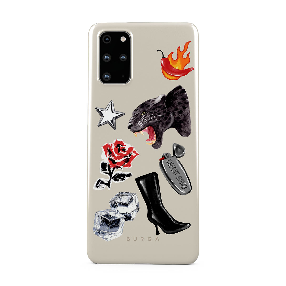 Dieses Design enthält: schwarzer Panther, rote Rose, brennende Paprika, silbernes Feuerzeug, schwarze kniehohe Stiefel, Eiswürfel, silberner Stern.
