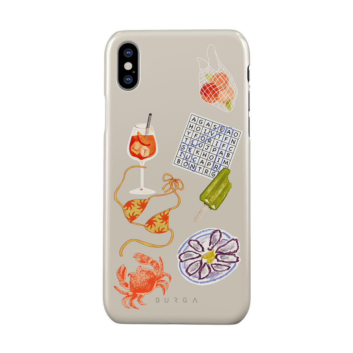 Dieses Design enthält: Krabbe, Austernplatte, Eis am Stiel, Kreuzworträtsel, Spritz-Cocktail, Bikini-Oberteil, Früchte.