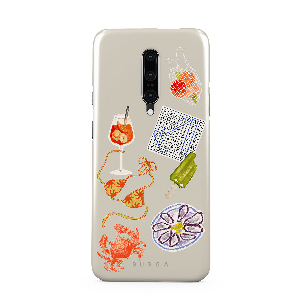 Dieses Design enthält: Krabbe, Austernplatte, Eis am Stiel, Kreuzworträtsel, Spritz-Cocktail, Bikini-Oberteil, Früchte.