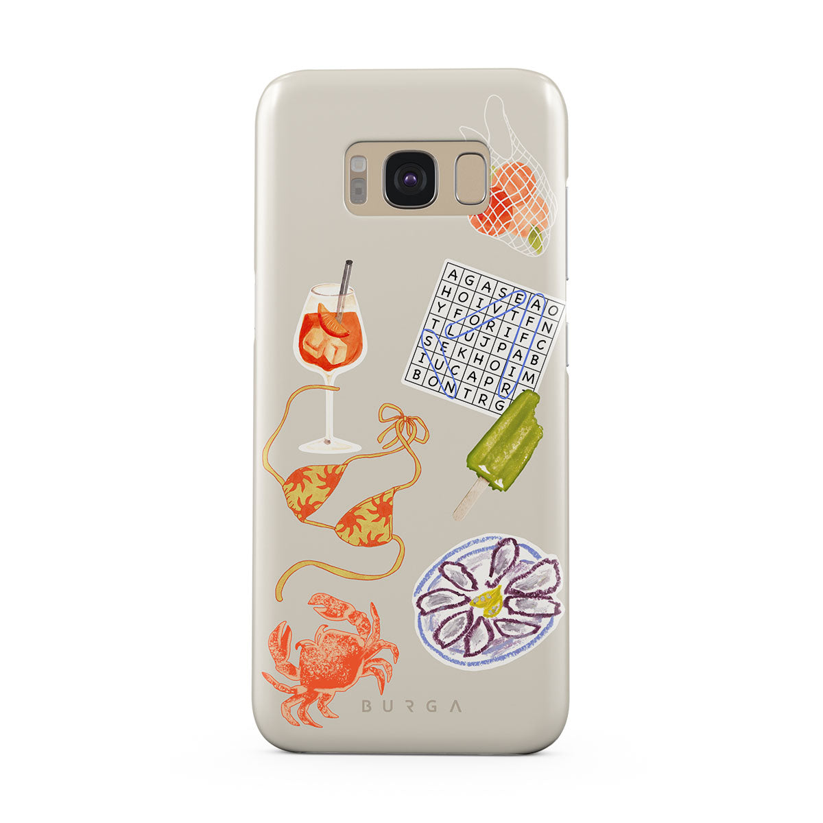 Dieses Design enthält: Krabbe, Austernplatte, Eis am Stiel, Kreuzworträtsel, Spritz-Cocktail, Bikini-Oberteil, Früchte.