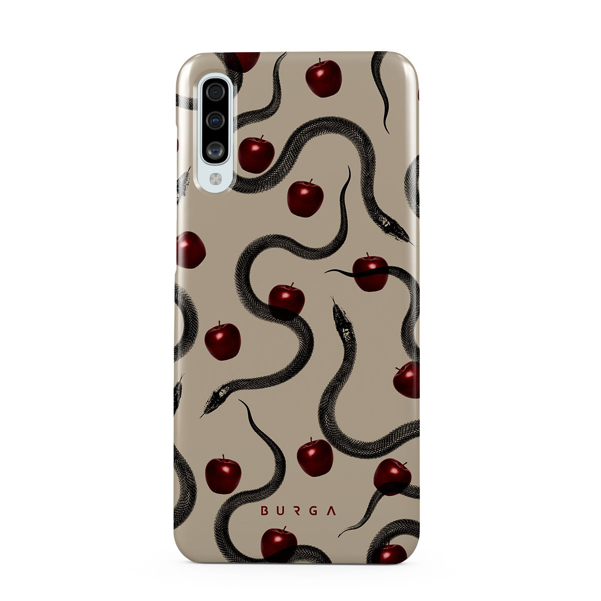 Dieses Design enthält: glänzende rote Äpfel, gewundene Schlangen, Beigetöne.
