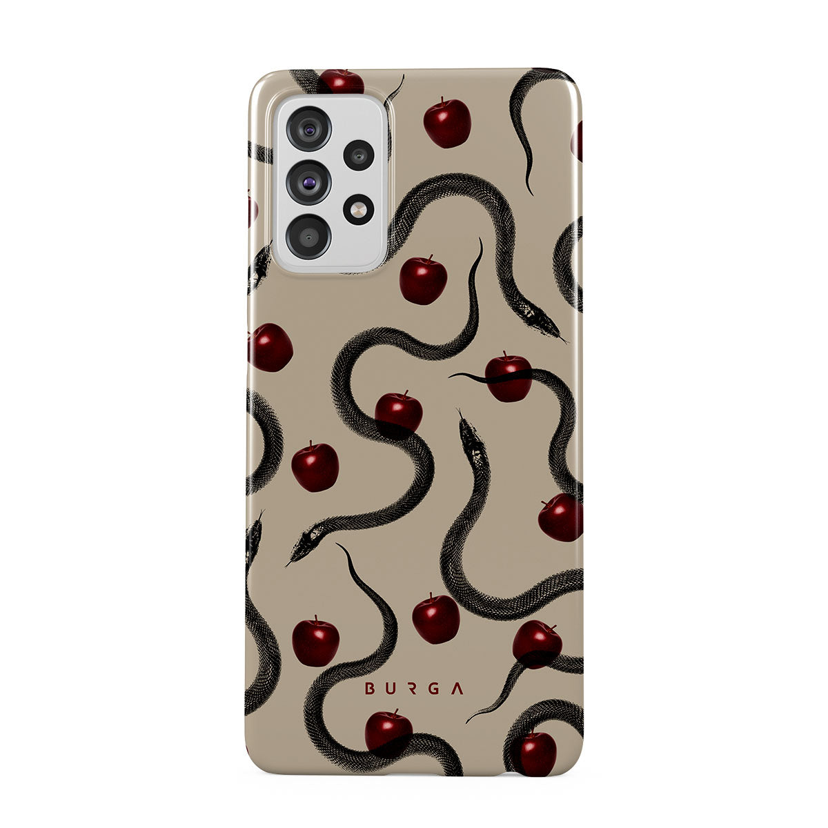 Dieses Design enthält: glänzende rote Äpfel, gewundene Schlangen, Beigetöne.