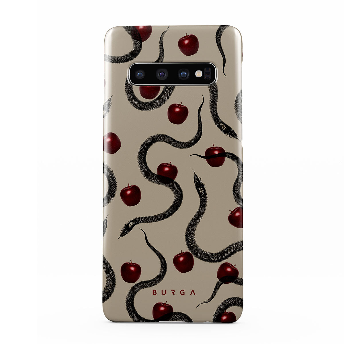 Dieses Design enthält: glänzende rote Äpfel, gewundene Schlangen, Beigetöne.