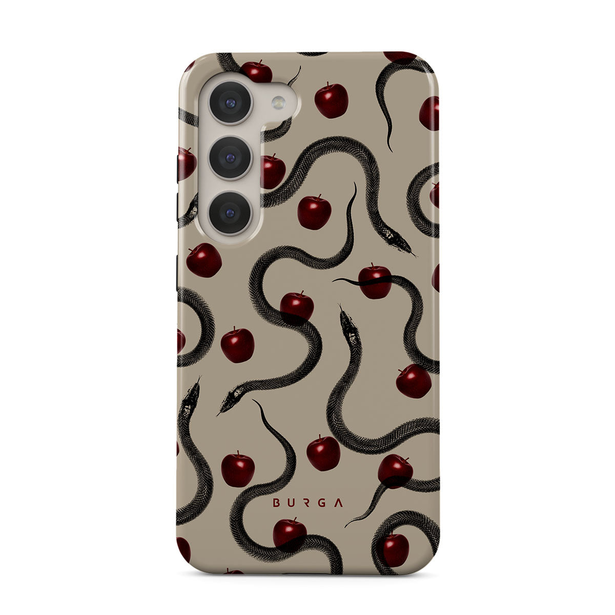 Dieses Design enthält: glänzende rote Äpfel, gewundene Schlangen, Beigetöne.