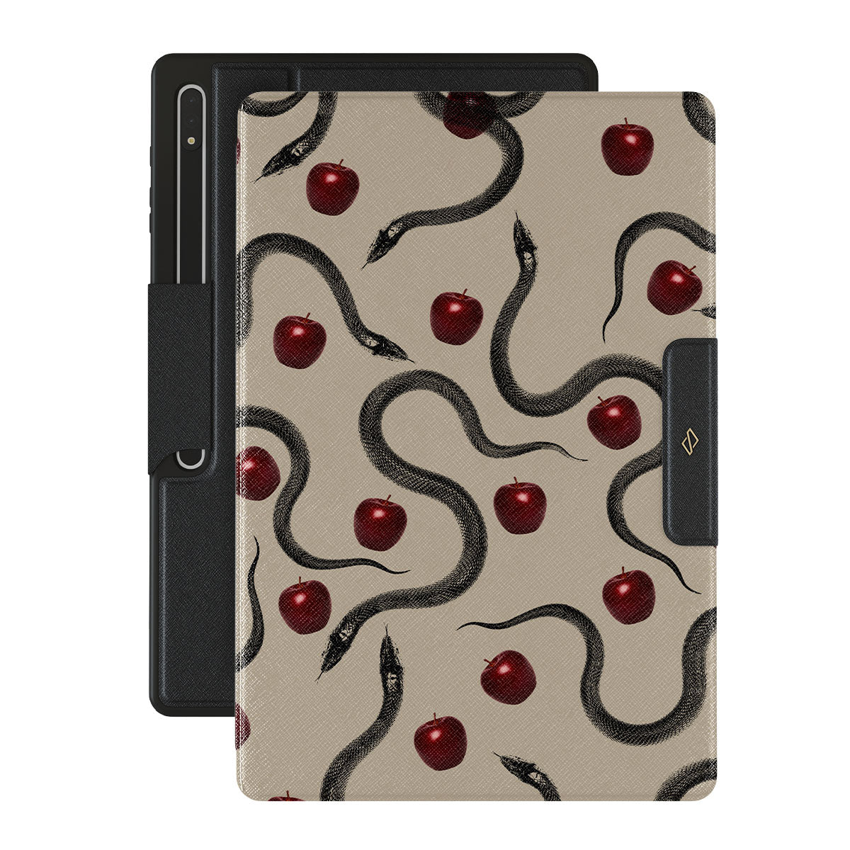 Dieses Design enthält: glänzende rote Äpfel, gewundene Schlangen, Beigetöne.