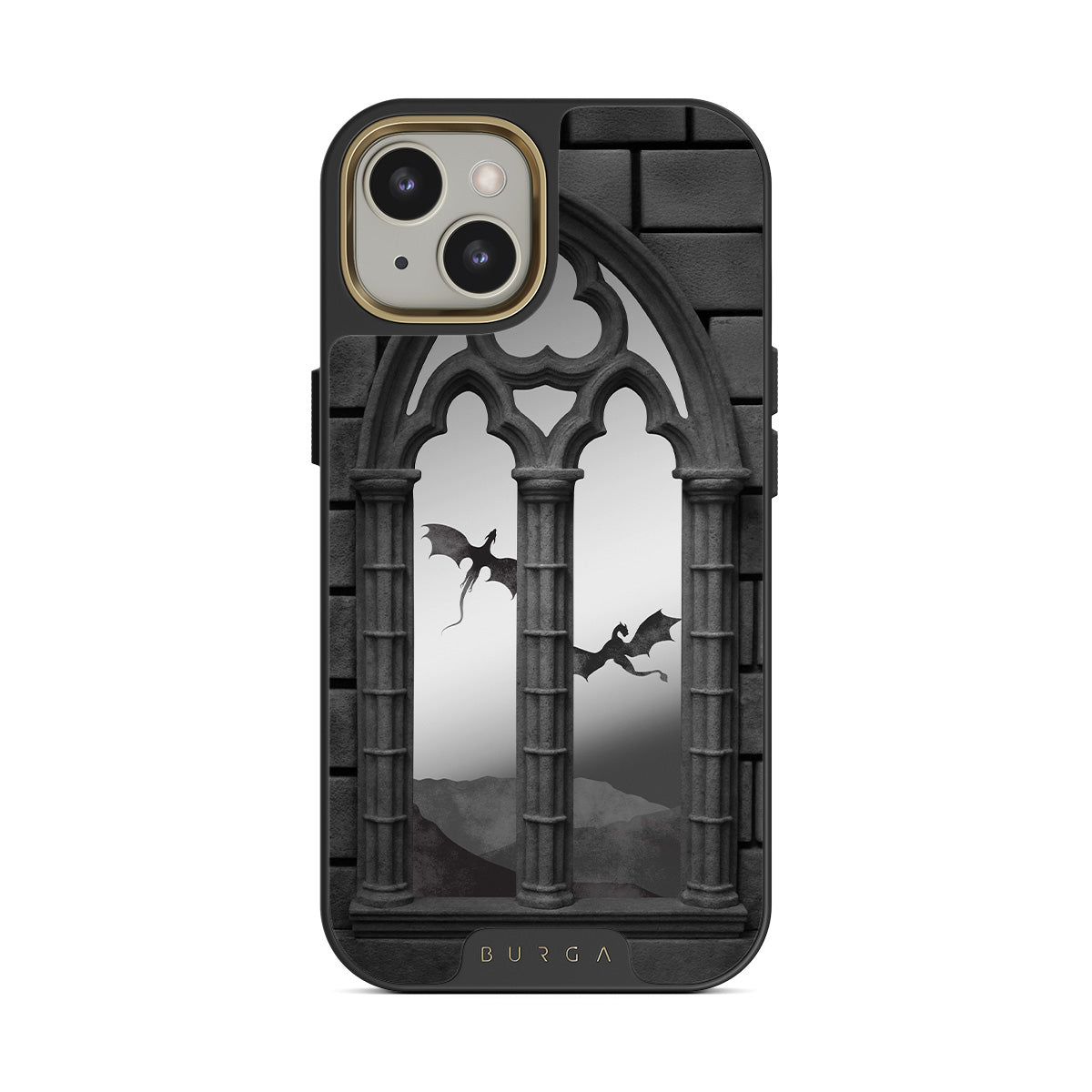 Dieses Design enthält: gotische Bögen, fliegende Drachen, mystische Kreaturen, Spiegel-Insertion