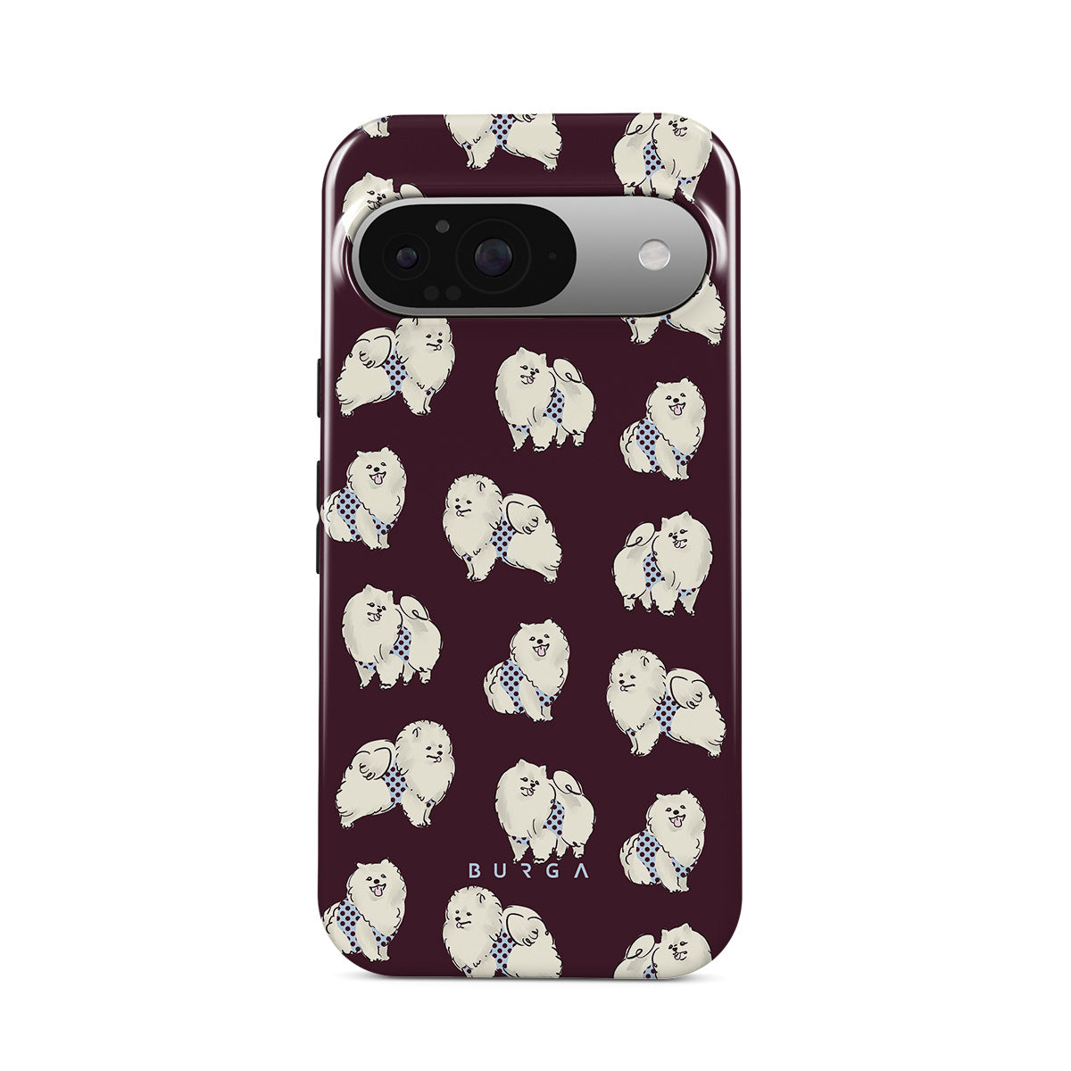 Dieses Design enthält: flauschige weiße Hunde auf einem tief bordeauxroten Hintergrund, Pudel und andere Haustiere.