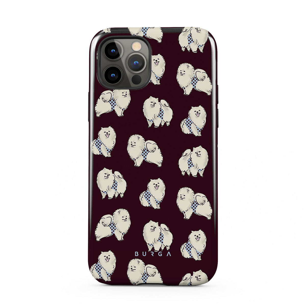 Dieses Design enthält: flauschige weiße Hunde auf einem tief bordeauxroten Hintergrund, Pudel und andere Haustiere.