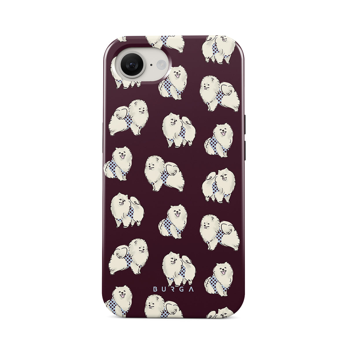Dieses Design enthält: flauschige weiße Hunde auf einem tief bordeauxroten Hintergrund, Pudel und andere Haustiere.