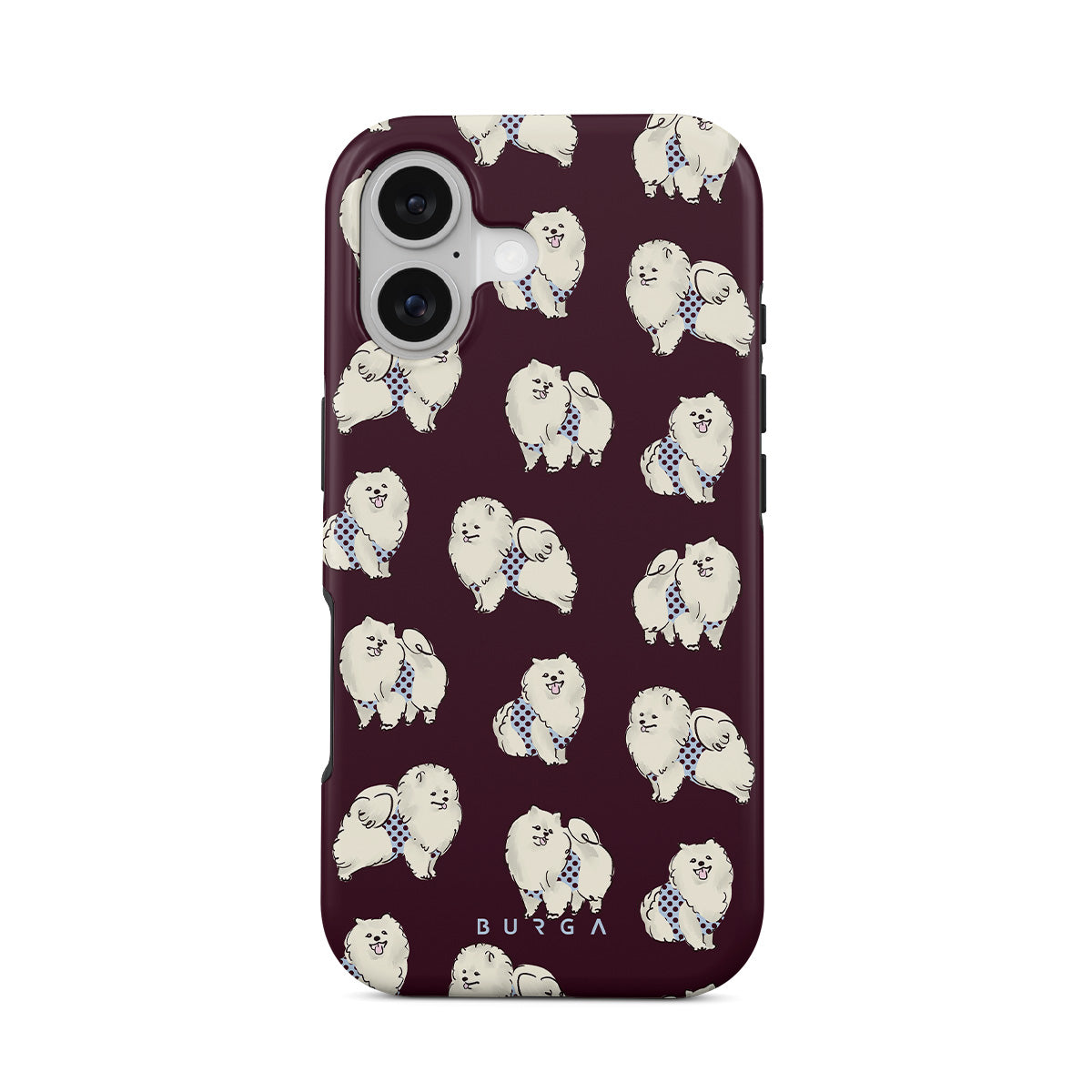 Dieses Design enthält: flauschige weiße Hunde auf einem tief bordeauxroten Hintergrund, Pudel und andere Haustiere.
