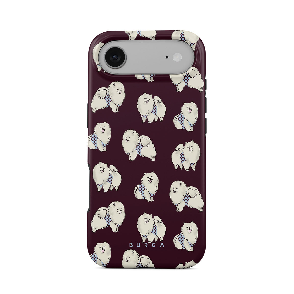 Dieses Design enthält: flauschige weiße Hunde auf einem tief bordeauxroten Hintergrund, Pudel und andere Haustiere.
