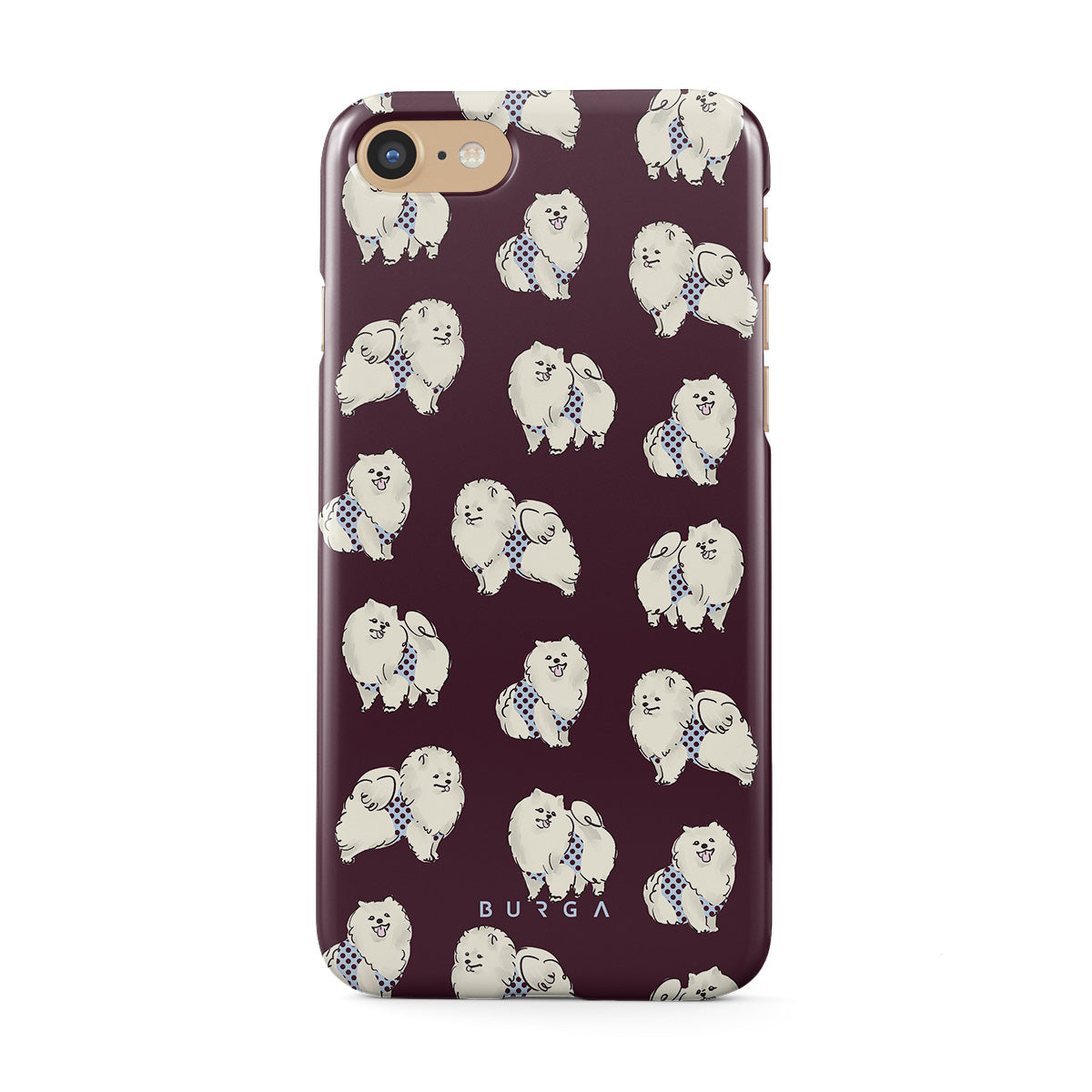 Dieses Design enthält: flauschige weiße Hunde auf einem tief bordeauxroten Hintergrund, Pudel und andere Haustiere.