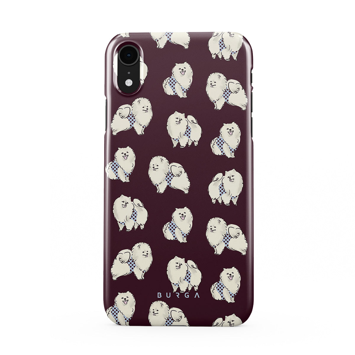 Dieses Design enthält: flauschige weiße Hunde auf einem tief bordeauxroten Hintergrund, Pudel und andere Haustiere.