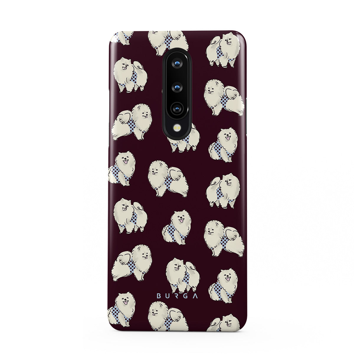 Dieses Design enthält: flauschige weiße Hunde auf einem tief bordeauxroten Hintergrund, Pudel und andere Haustiere.