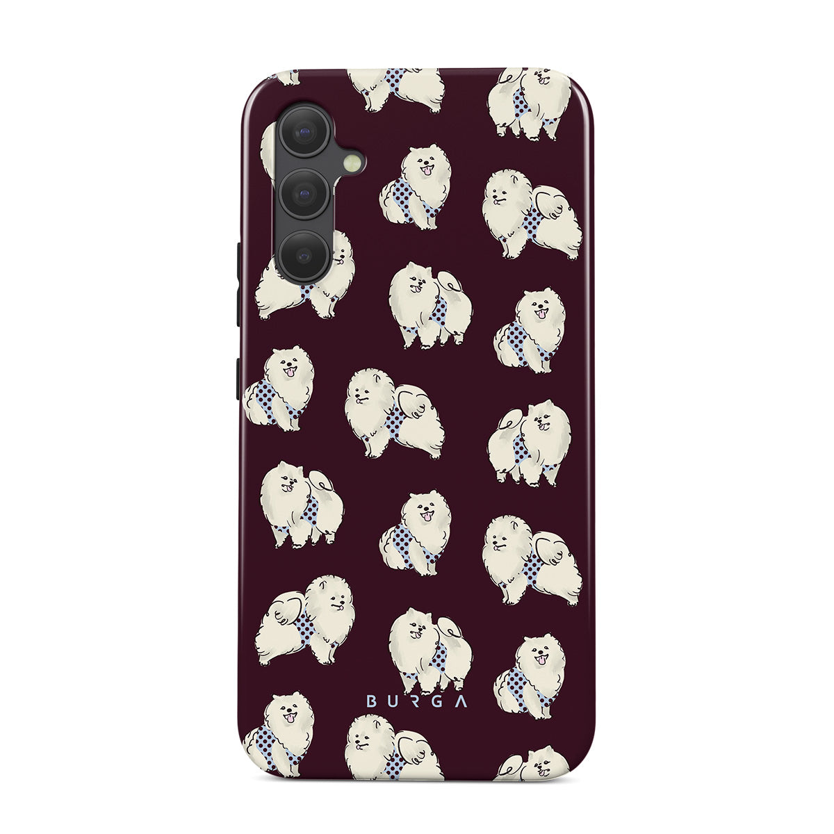 Dieses Design enthält: flauschige weiße Hunde auf einem tief bordeauxroten Hintergrund, Pudel und andere Haustiere.