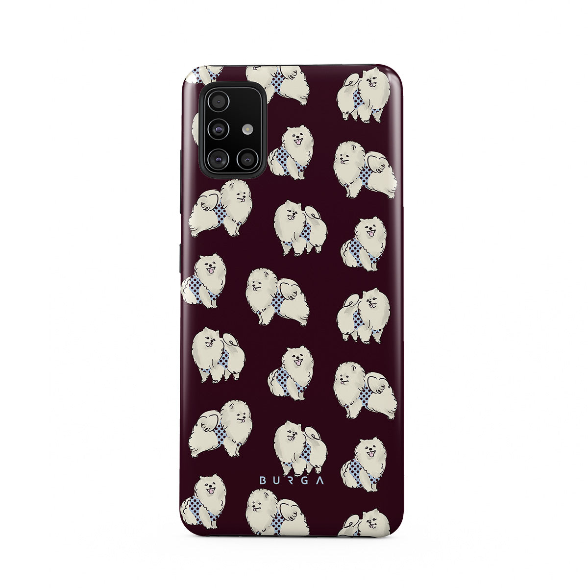Dieses Design enthält: flauschige weiße Hunde auf einem tief bordeauxroten Hintergrund, Pudel und andere Haustiere.