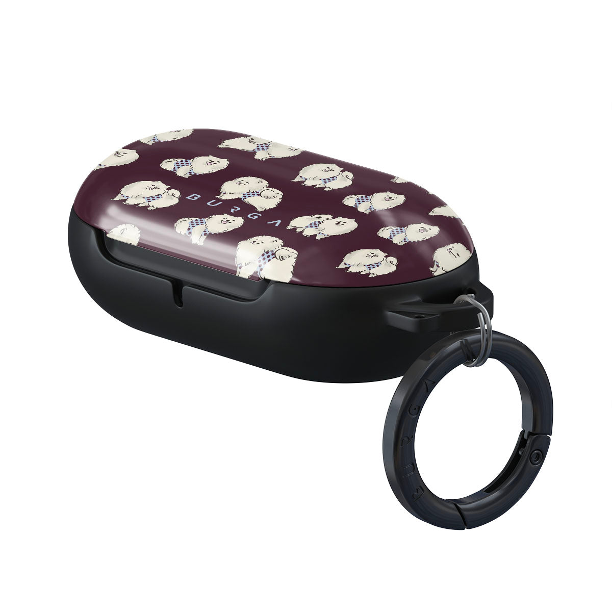 Dieses Design enthält: flauschige weiße Hunde auf einem tief bordeauxroten Hintergrund, Pudel und andere Haustiere.