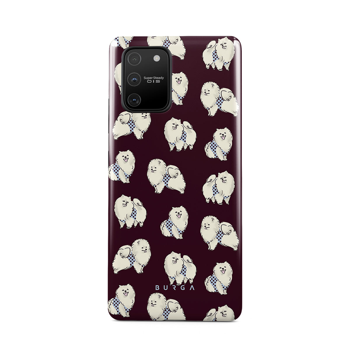 Dieses Design enthält: flauschige weiße Hunde auf einem tief bordeauxroten Hintergrund, Pudel und andere Haustiere.