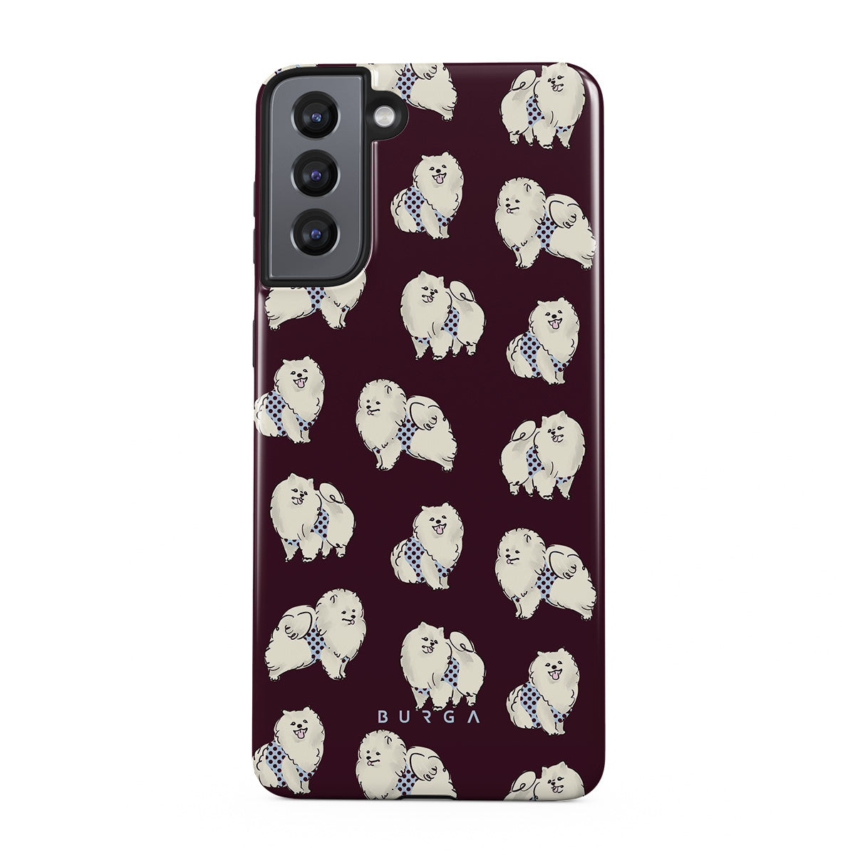 Dieses Design enthält: flauschige weiße Hunde auf einem tief bordeauxroten Hintergrund, Pudel und andere Haustiere.