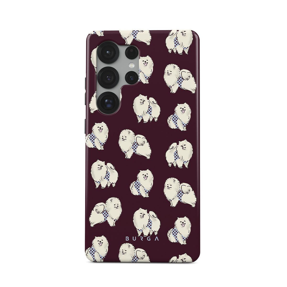 Dieses Design enthält: flauschige weiße Hunde auf einem tief bordeauxroten Hintergrund, Pudel und andere Haustiere.