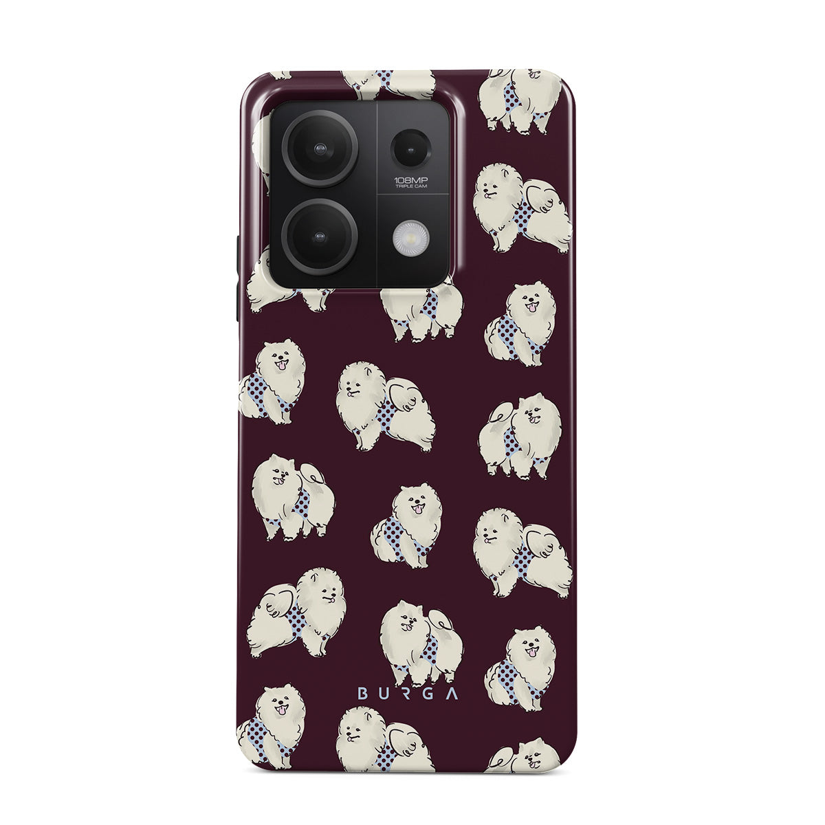Dieses Design enthält: flauschige weiße Hunde auf einem tief bordeauxroten Hintergrund, Pudel und andere Haustiere.