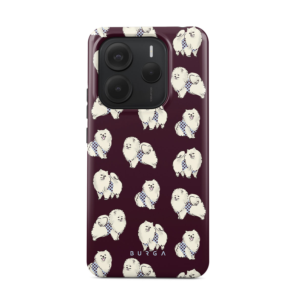 Dieses Design enthält: flauschige weiße Hunde auf einem tief bordeauxroten Hintergrund, Pudel und andere Haustiere.