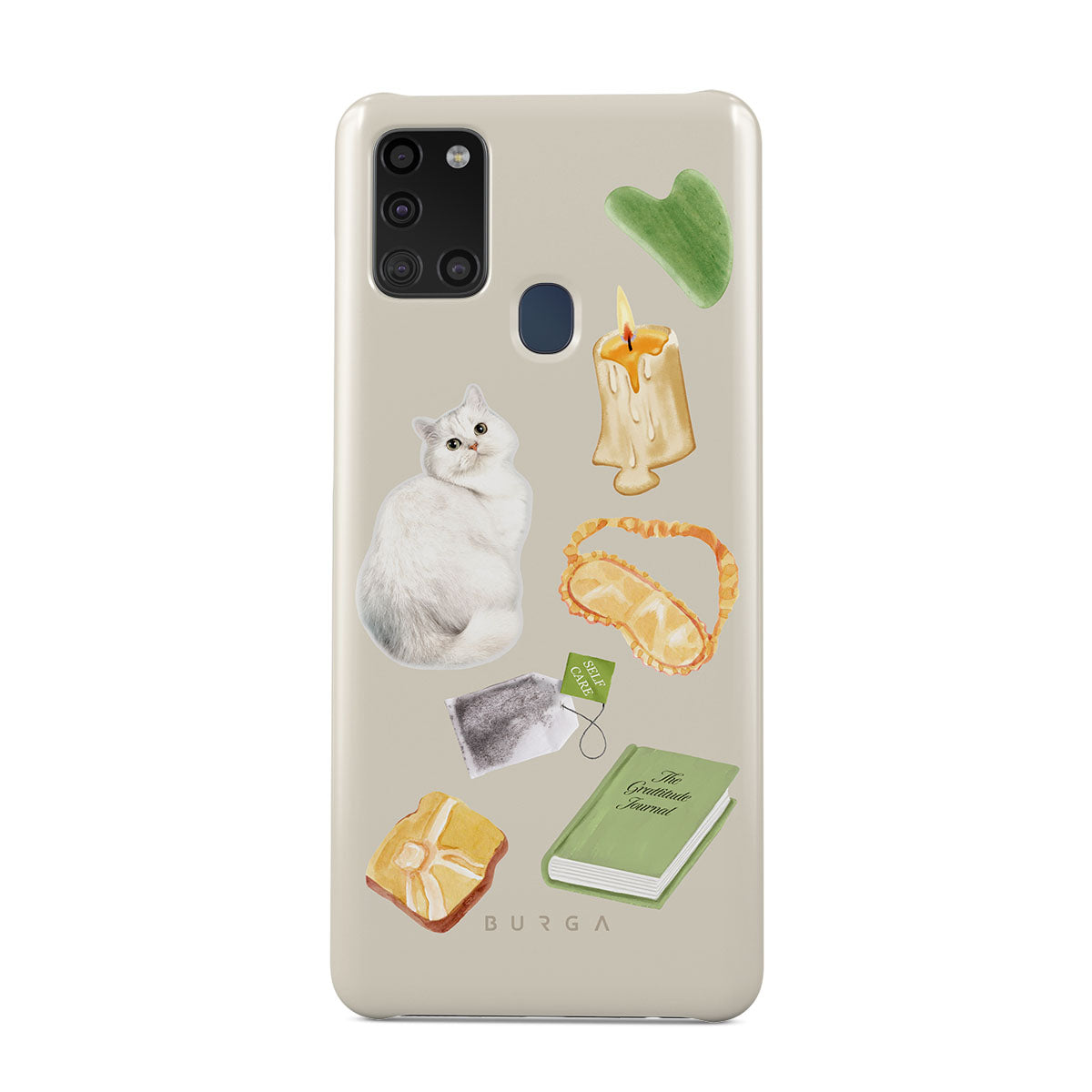 Dieses Design enthält: weiße Katze, grünes Buch, Kerze, Gua Sha-Stab, Schlafmaske, Teebeutel, gelber Kristall.