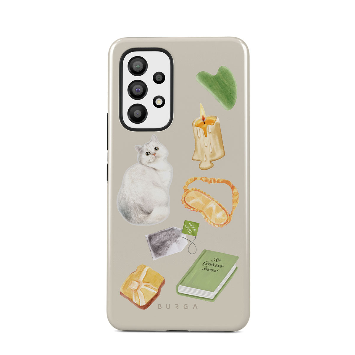 Dieses Design enthält: weiße Katze, grünes Buch, Kerze, Gua Sha-Stab, Schlafmaske, Teebeutel, gelber Kristall.