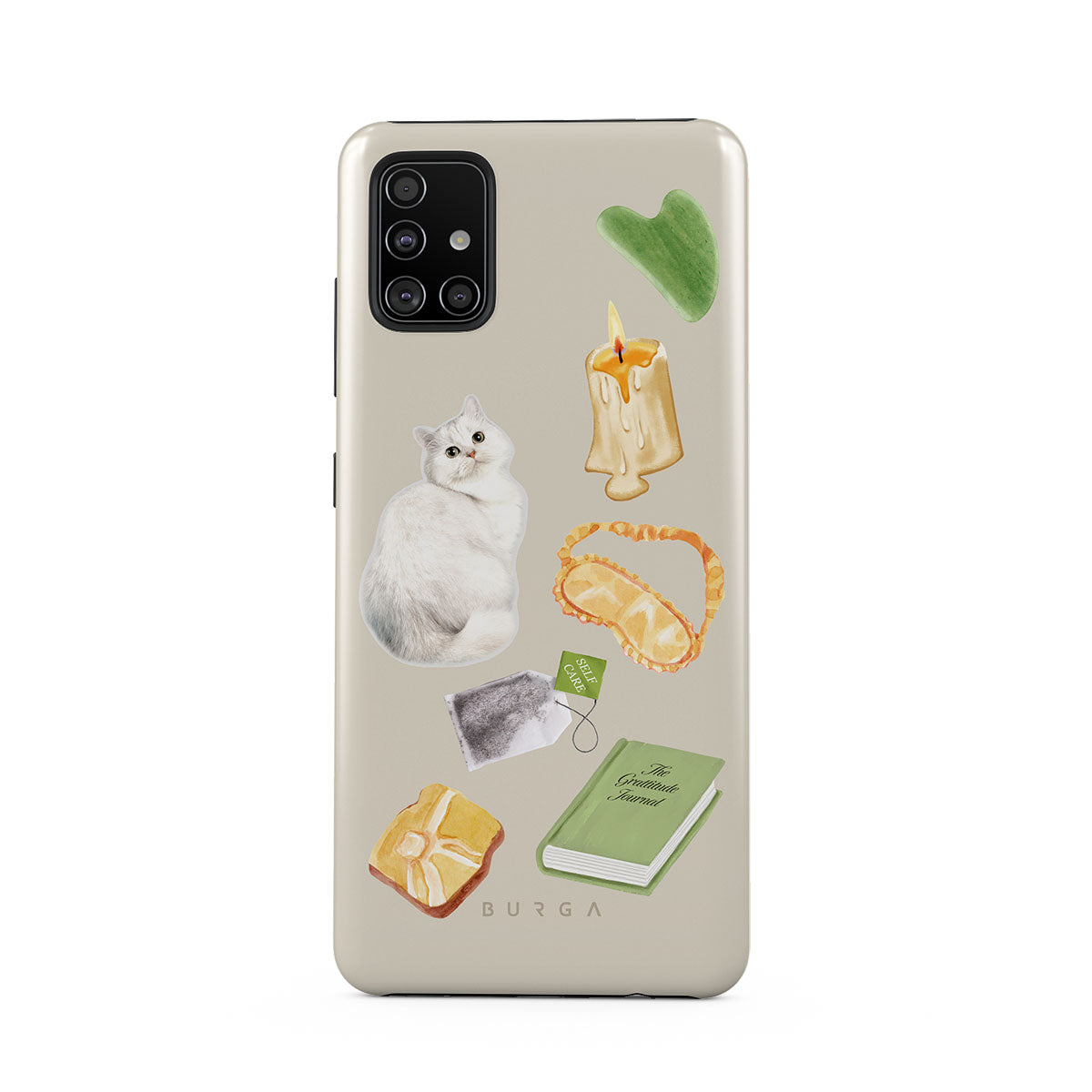 Dieses Design enthält: weiße Katze, grünes Buch, Kerze, Gua Sha-Stab, Schlafmaske, Teebeutel, gelber Kristall.