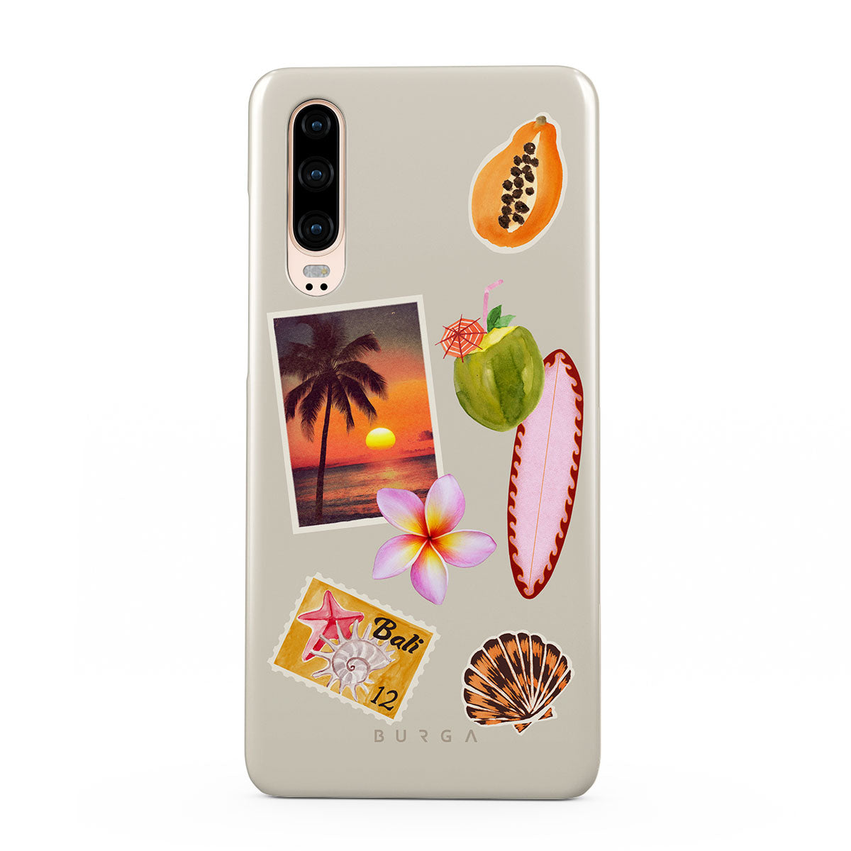 Dieses Design enthält: tropisches Sonnenuntergangsfoto, Papaya, grüne Kokosnuss, pinkes Surfbrett, pinke Plumeria-Blüte, orangefarbene Muschel, Bali-Postkarte.
