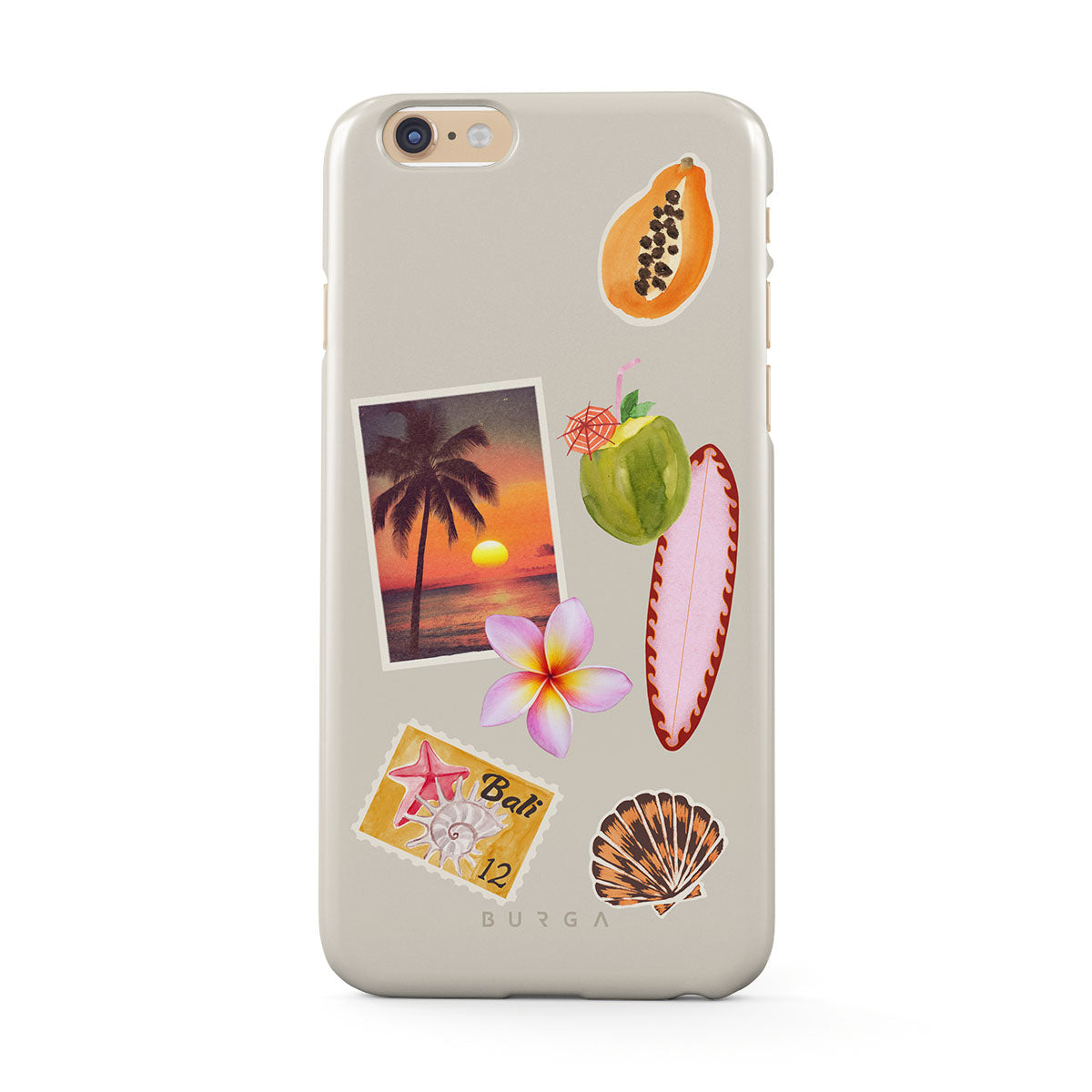 Dieses Design enthält: tropisches Sonnenuntergangsfoto, Papaya, grüne Kokosnuss, pinkes Surfbrett, pinke Plumeria-Blüte, orangefarbene Muschel, Bali-Postkarte.