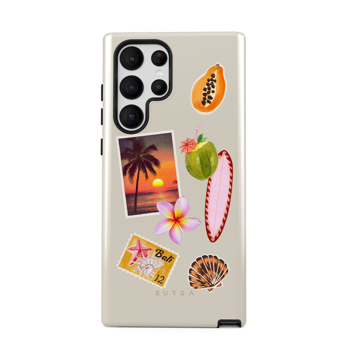 Dieses Design enthält: tropisches Sonnenuntergangsfoto, Papaya, grüne Kokosnuss, pinkes Surfbrett, pinke Plumeria-Blüte, orangefarbene Muschel, Bali-Postkarte.