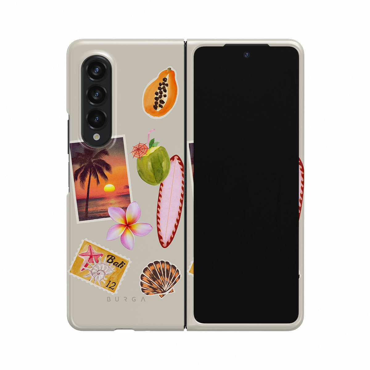 Dieses Design enthält: tropisches Sonnenuntergangsfoto, Papaya, grüne Kokosnuss, pinkes Surfbrett, pinke Plumeria-Blüte, orangefarbene Muschel, Bali-Postkarte.