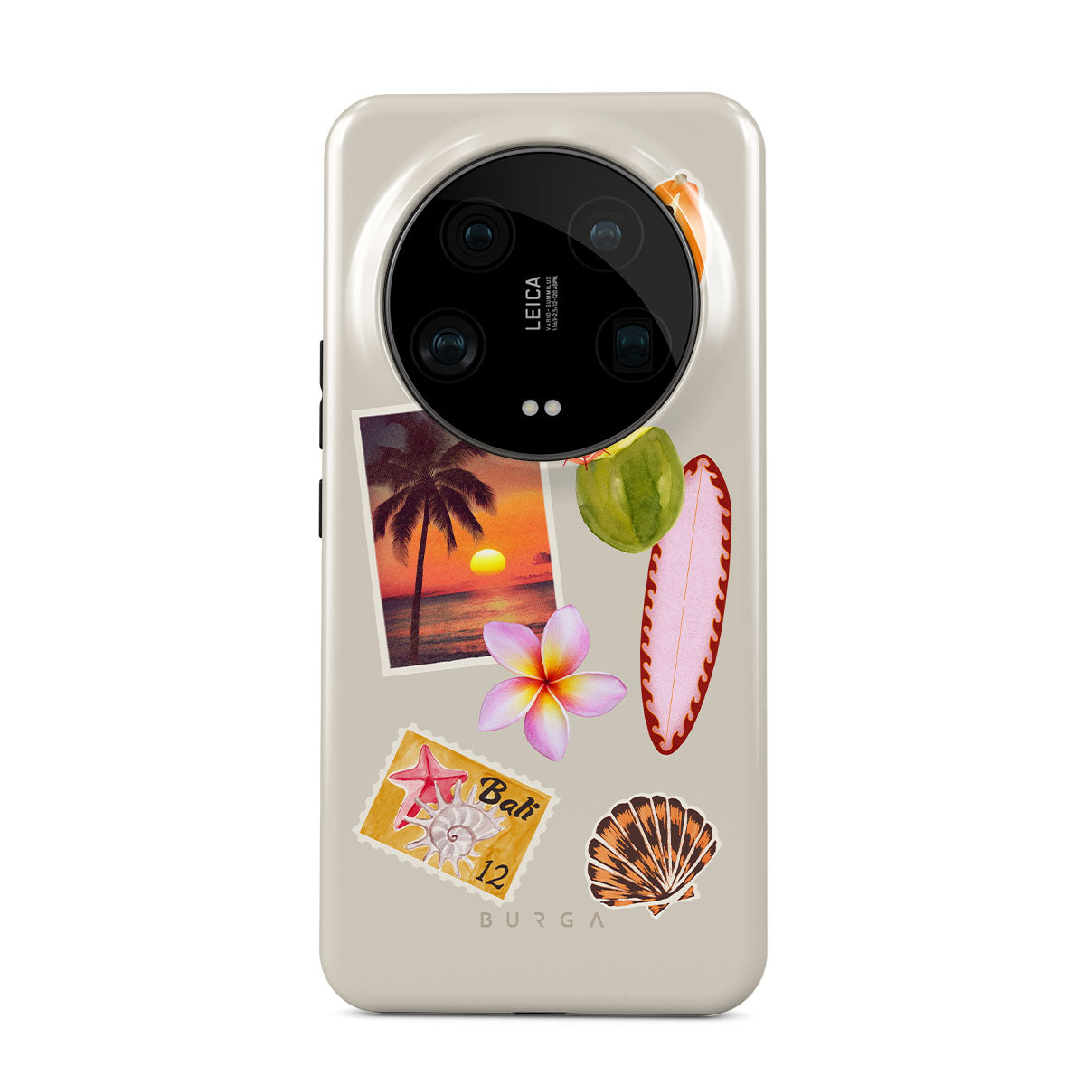 Dieses Design enthält: tropisches Sonnenuntergangsfoto, Papaya, grüne Kokosnuss, pinkes Surfbrett, pinke Plumeria-Blüte, orangefarbene Muschel, Bali-Postkarte.